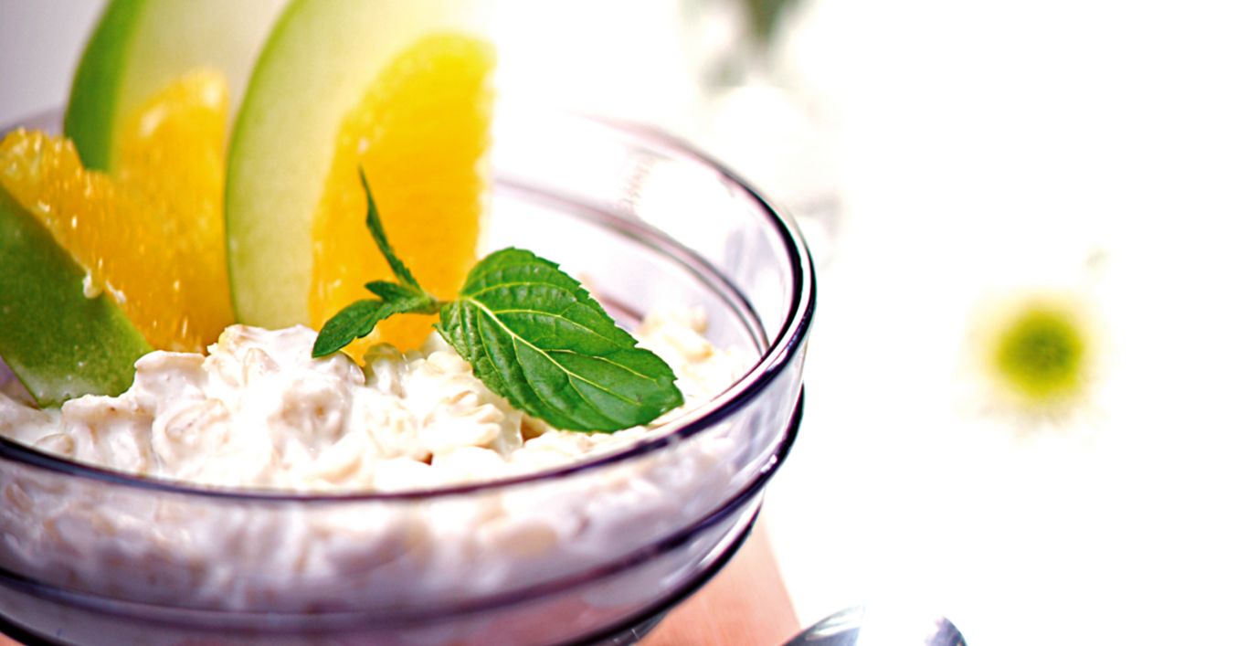 Плодовете се нарязват на кубчета или на лодки. Прибавят се киселото мляко, захар на вкус и овесените ядки, и се разбърква.