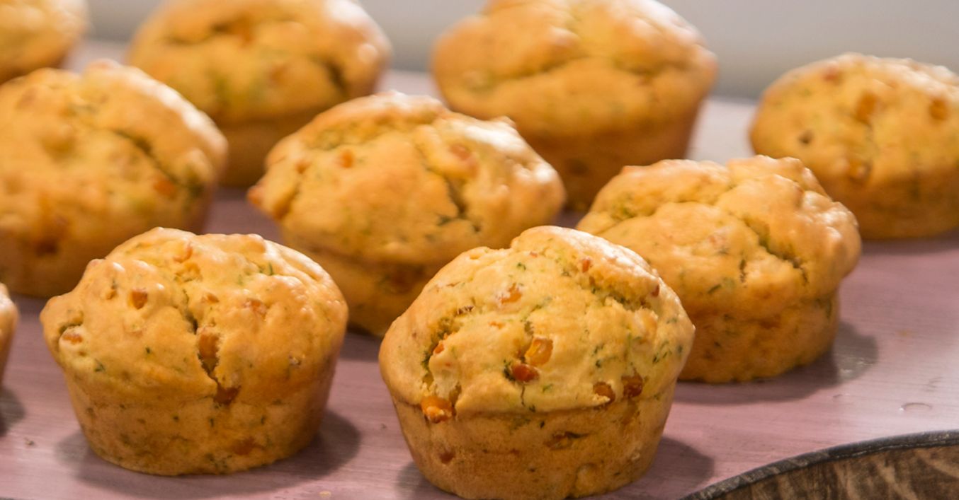 Сместа се разпределя във форма за мъфини, намазана със маслиново масло. Пекат се 45 минути.