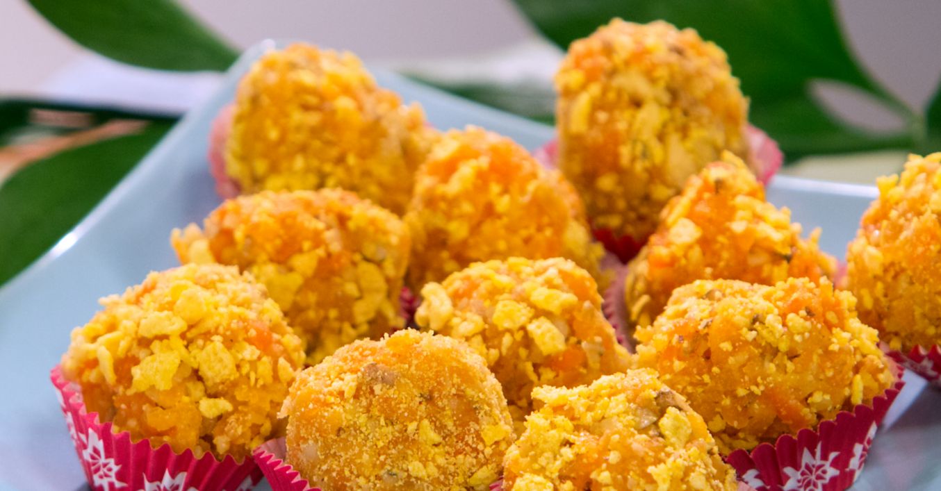 От морковената смес се оформят топчета, които се овалват в корнфлейкса.