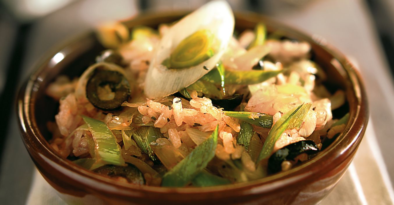 Прибавят се доматеното пюре и червеният пипер, разбърква се и след 2–3 минути се добавят оризът, маслините, джодженът, сол и черен пипер на вкус.