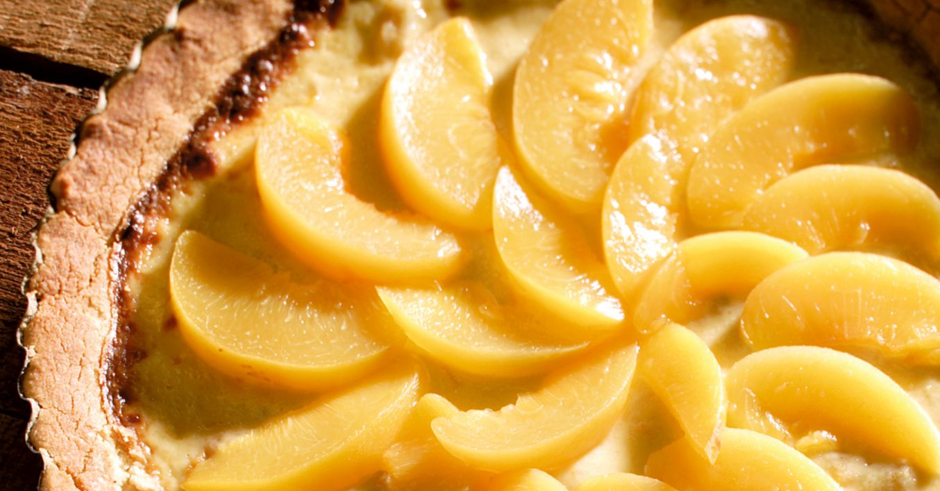 Яйцата се разбиват в купа, добавят се млякото, сметаната, захарта, ванилията и половината от прасковите, нарязани на кубчета. Останалите се режат на лодки и се оставят за украса. Сместа се сгъстява на водна баня около 10 минути, като непрекъснато се бърка.