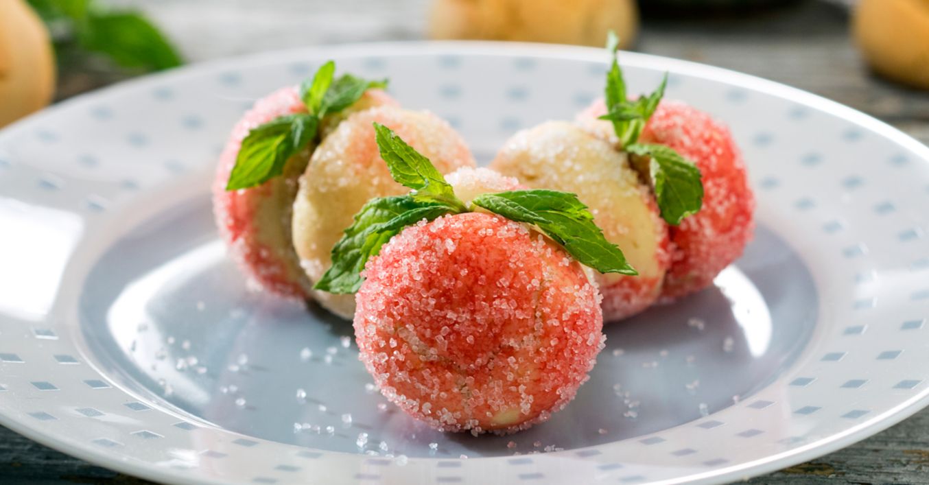 Овалват се в захар и се украсяват с листа мента.