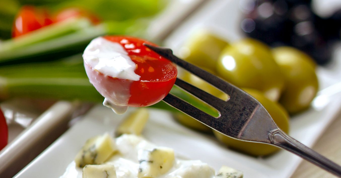Зеленчуците се подреждат в чинии за сервиране и се гарнират с маслините, а дресингът от сирената се поднася в сосиера.