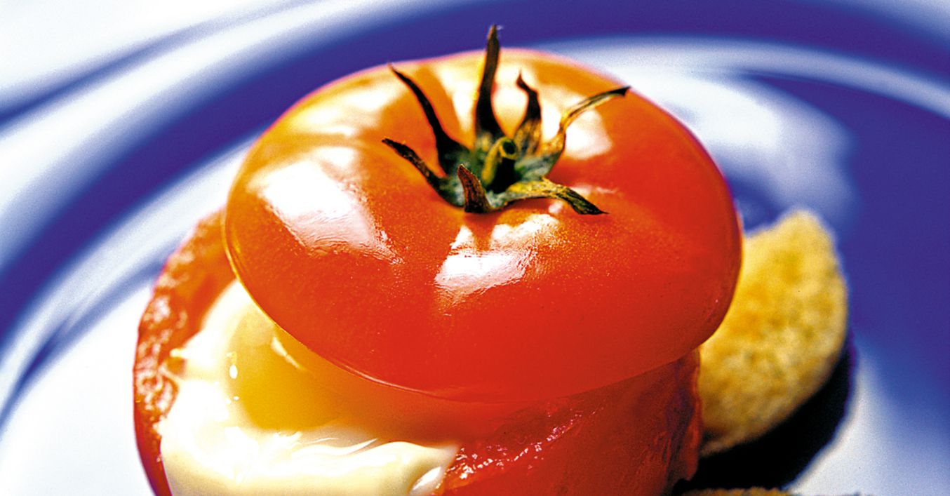 Чесънът се счуква, смесва се с 1 с. л. от олиото и се разбърква добре. С получената смес се намазва вътрешността на доматите. На дъното на всеки от тях се слага от натрошеното сирене, отгоре се чуква по едно яйце, подреждат се в тава и се покриват с алуминиево фолио. Пекат се 10–15 минути в силно загрята фурна.