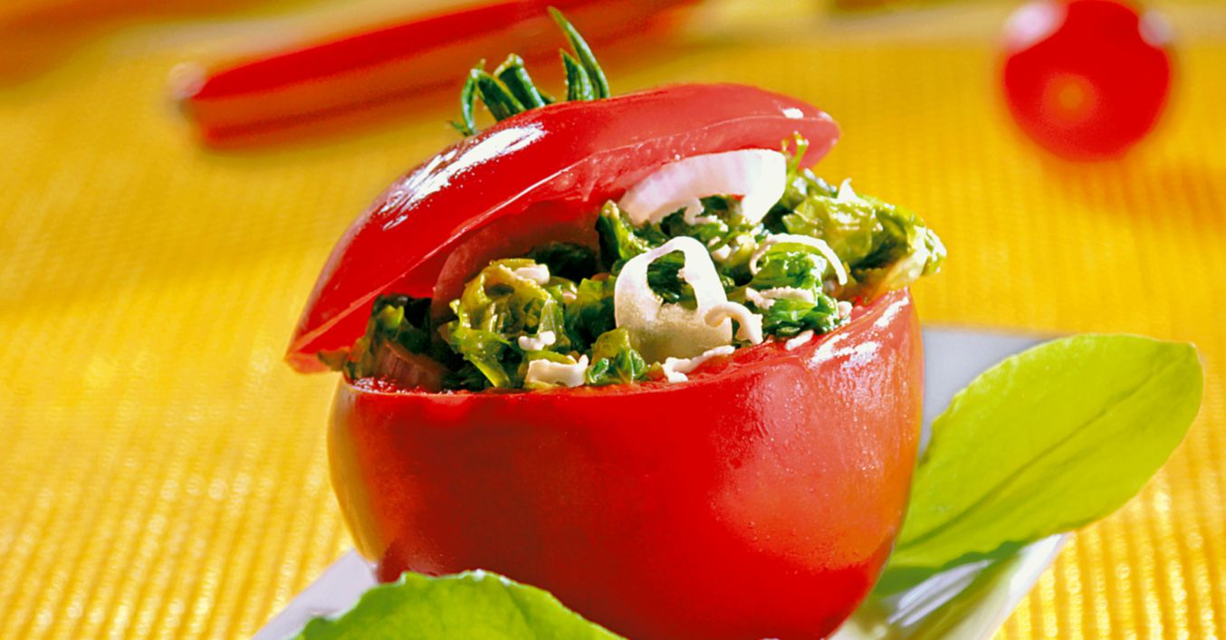 Доматите се измиват, от горната част се отрязват капачета, а вътрешността се издълбава с лъжичка.