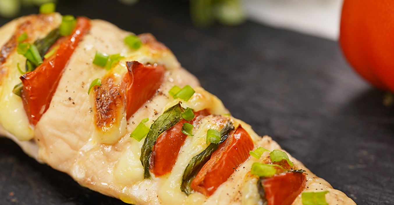 Моцарелата се нарязва на парчета със същата големина като домата. Взима се парче домат, отгоре се слагат листо пресен босилек и парче моцарела и се пъхат в едно от "джобчетата" на пилешкото месо. Повторя се докато се напълнят всички "джобчета".