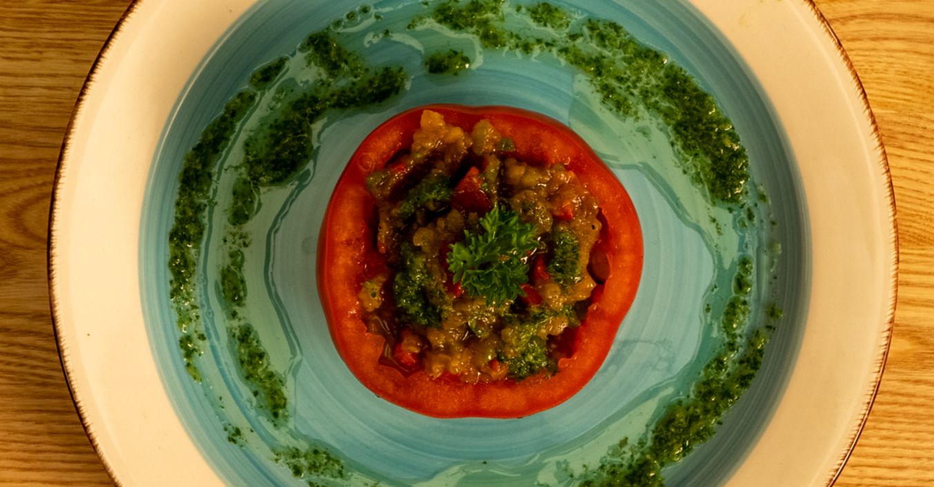 Доматът се обелва, издълбава и се пълни със сместа от патладжан и чушки.