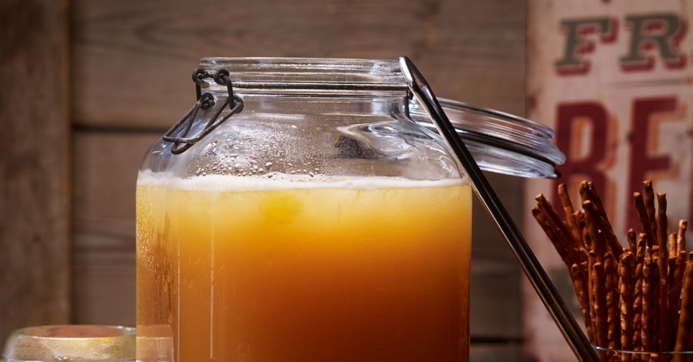 Бирата и портокаловият сок се изливат в купа за боле. Добавят се маринованите портокалови резенчета и радлер болето е готово за сервиране.