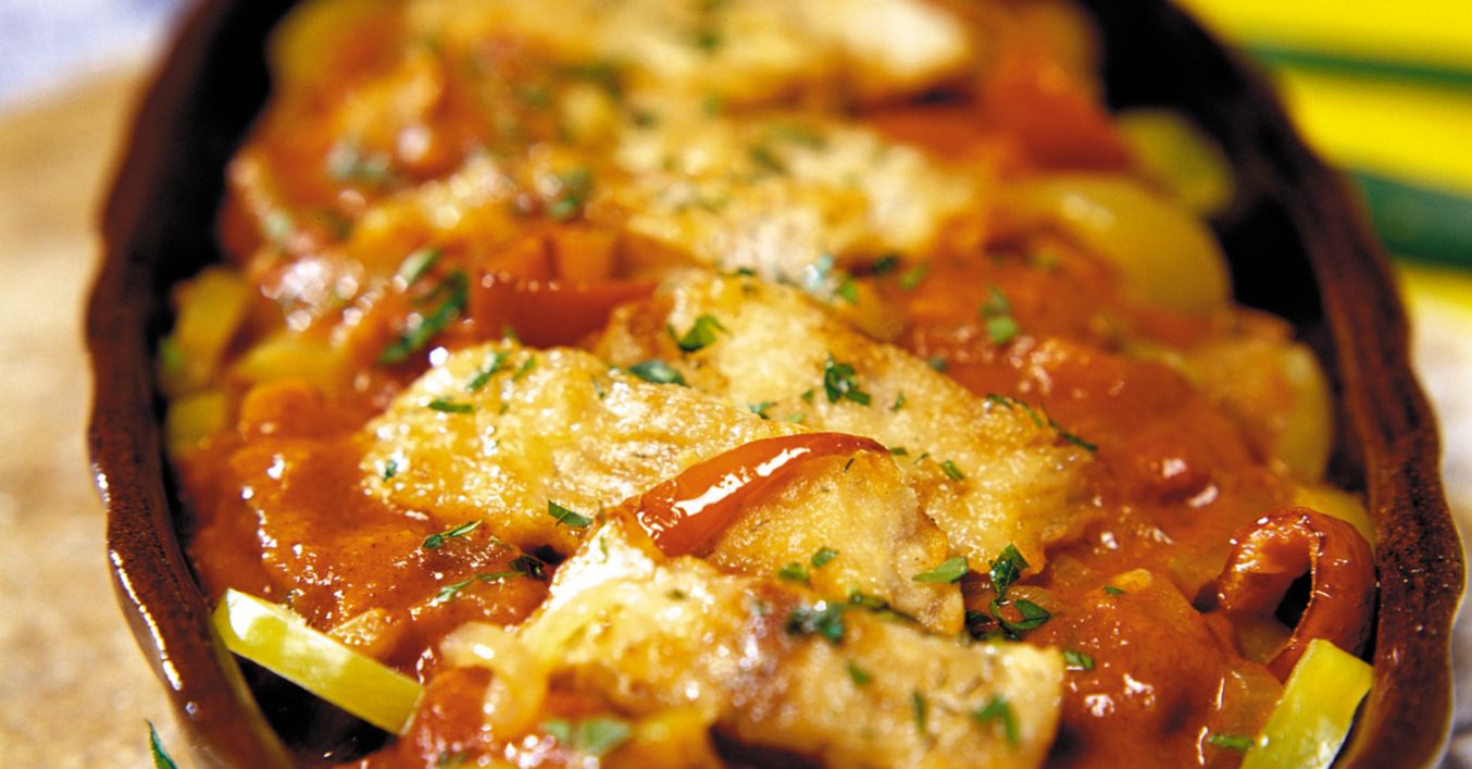 Рибеното филе се нарязва на едри парчета и се поставя на дъното на намаслено гювече. Върху него се изсипват готовите зеленчуци и се поръсват със ситно нарязаните копър и магданоз.