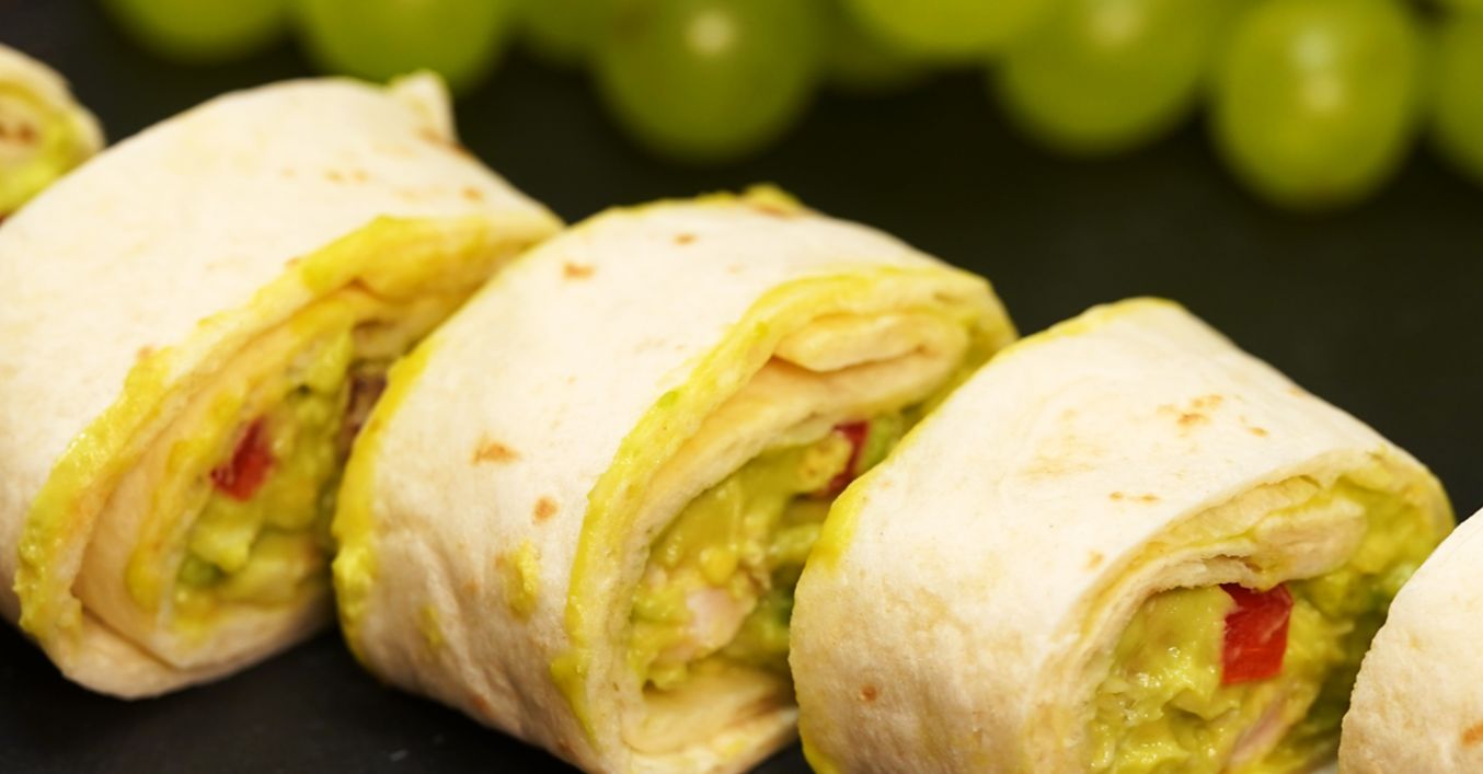 Готовата смес се разпределя върху тортилата и се завива на руло. Нарязва се на парчета с дебелина около сантиметър, за да се получат мини рулца с авокадо и пилешко.