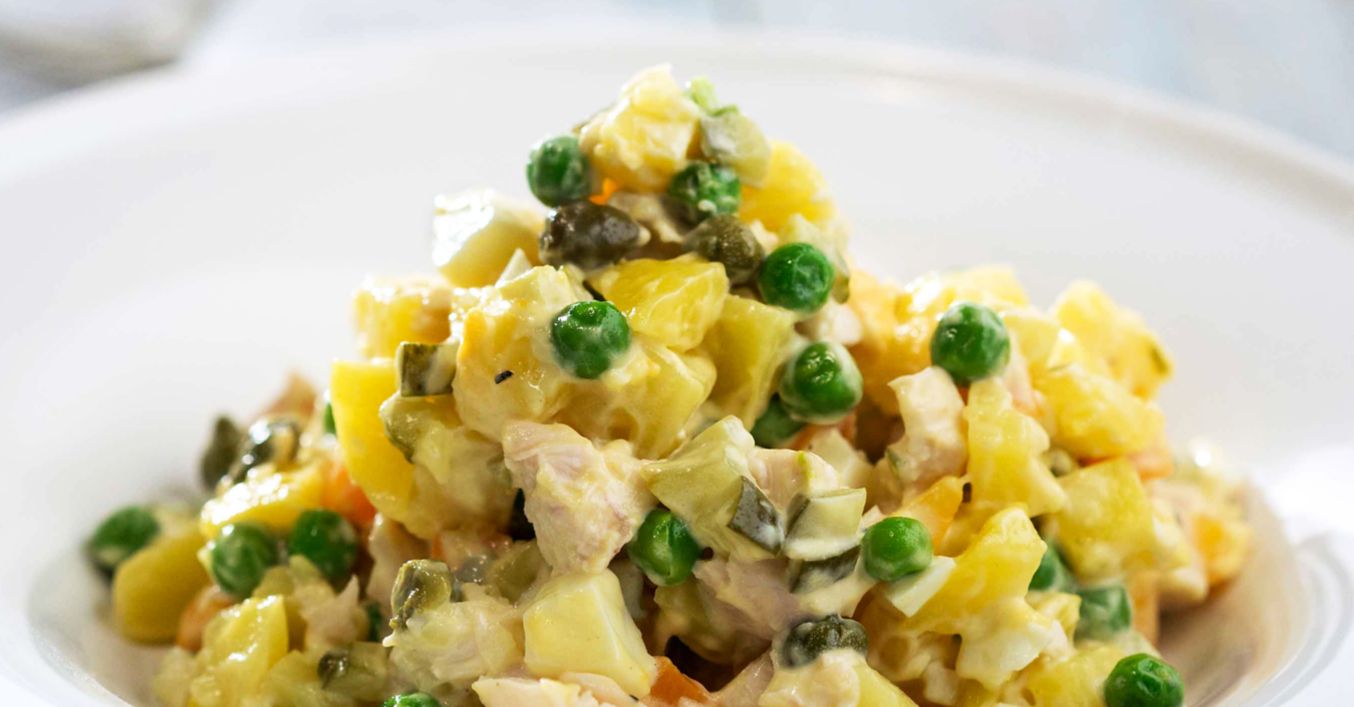 Картофите, морковите, краставичките и лукът се режат на дребни кубчета и се смесват в голяма купа. Към зеленчуците се добавят грахът, каперсите, месото и яйцата.