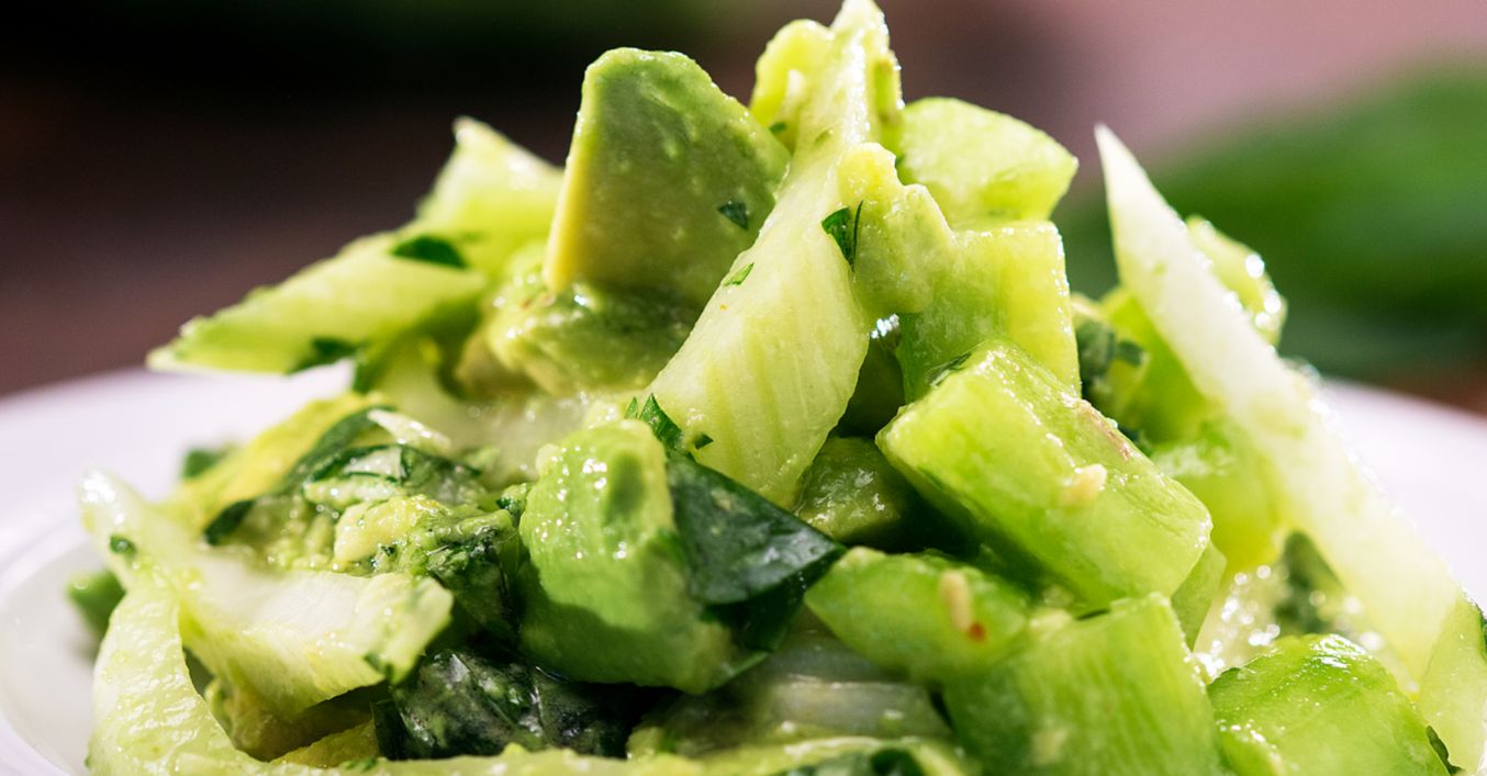 След това към тях се прибавят нарязаните листа от кориандъра, магданоза и босилека. Слага се и стеблената целина, обелена и нарязана косо. Овкусява се със сол, сока от лайм и олиото.