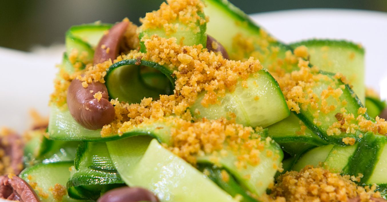 Краставиците се смесват с маслините, подправят се с останалото маслиново масло, сока от лайм и сол на вкус. Салатата се поднася поръсена с хрупкавите трохи.
