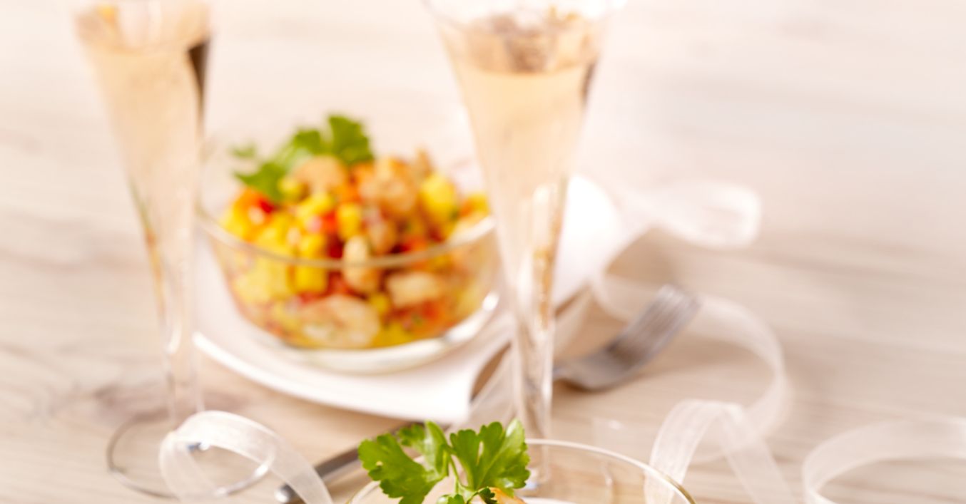 Скаридите се измиват и подсушават. За дресинга се разбъркват олиото, оцета, ябълковия сок, табаското, солта и магданоза. Чушката, мангото, лукът и скаридите се смесват с дресинга.