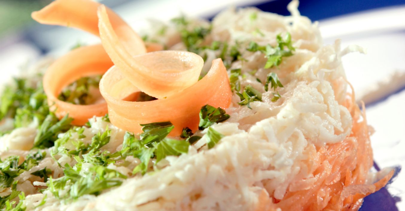 Морковите се почистват, настъргват се на едро ренде и се изсипват в купата с ябълките. Салатата се овкусява със сол и се поръсва с наситнените целина и магданоз.