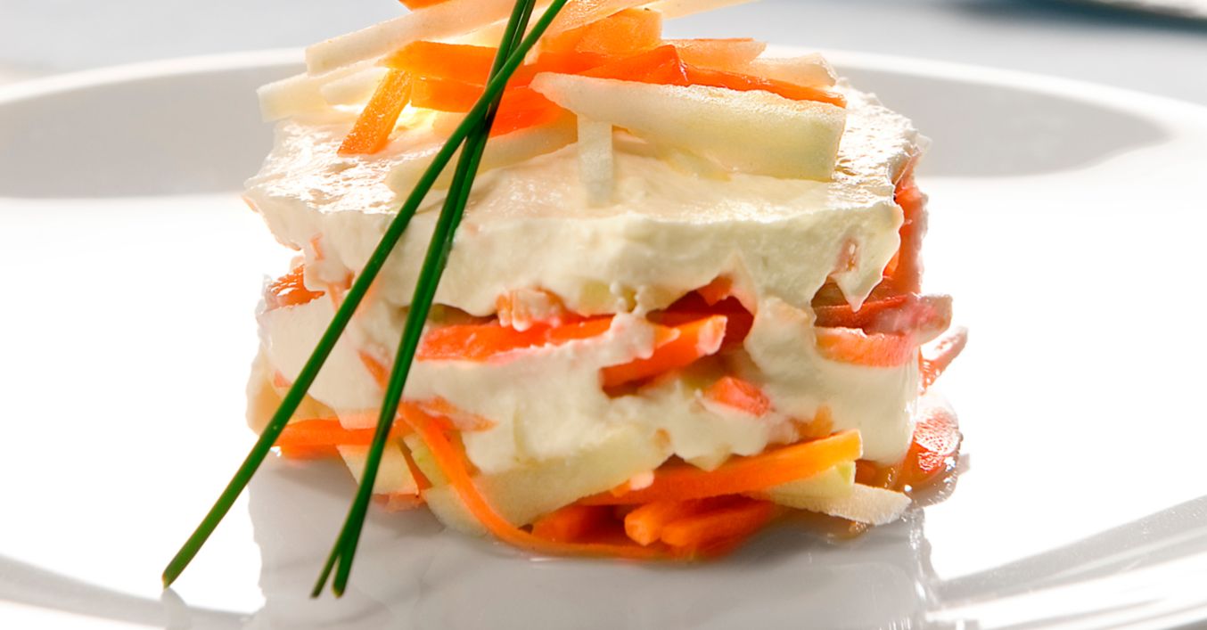Слага се ред ябълки и моркови, ред – сирене и сметана. Украсява се с пера див лук.