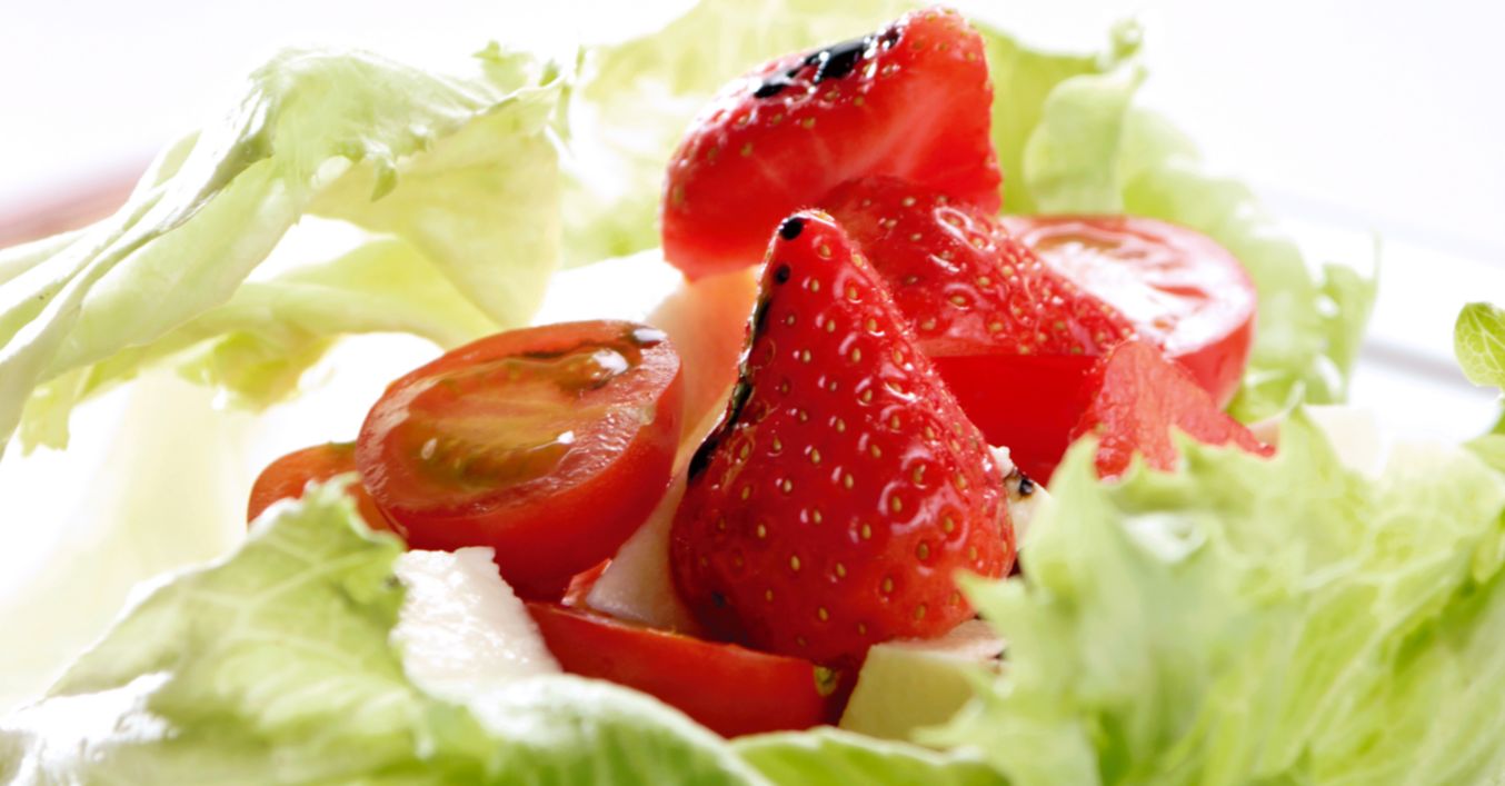 Листата от салатата се оформят като кошница и в тях се слагат ягодите, доматчетата и бейби моцарелата. Поръсва се с редуцирания балсамов оцет и се сервира.