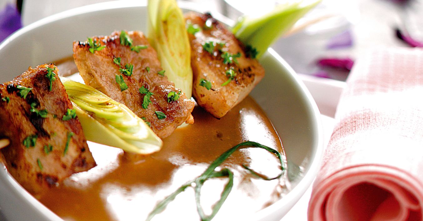 Празът се реже на дебели шайби. Кубчетата месо се нанизват на шиш, като се редуват с парчетата праз.