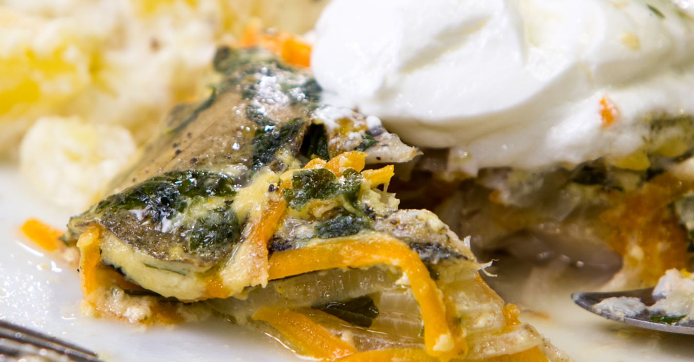 Лукът се нарязва на кръгчета, морковът се настъргва, а магданозът се наситнява. Зеленчуците и рибата се подреждат на пластове в дълбок намазнен тиган.