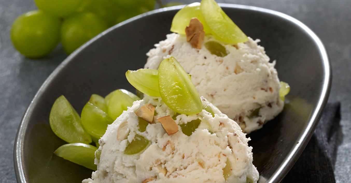Готовият сладолед се разпределя в десертни чинийки и по желание се гарнира с грозде и мента.