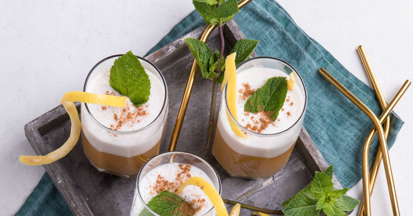 Готовото смути се налива в четири чаши. Гарнира се по желание с резенчета лимон и късчета мента и се сервира със сламки.