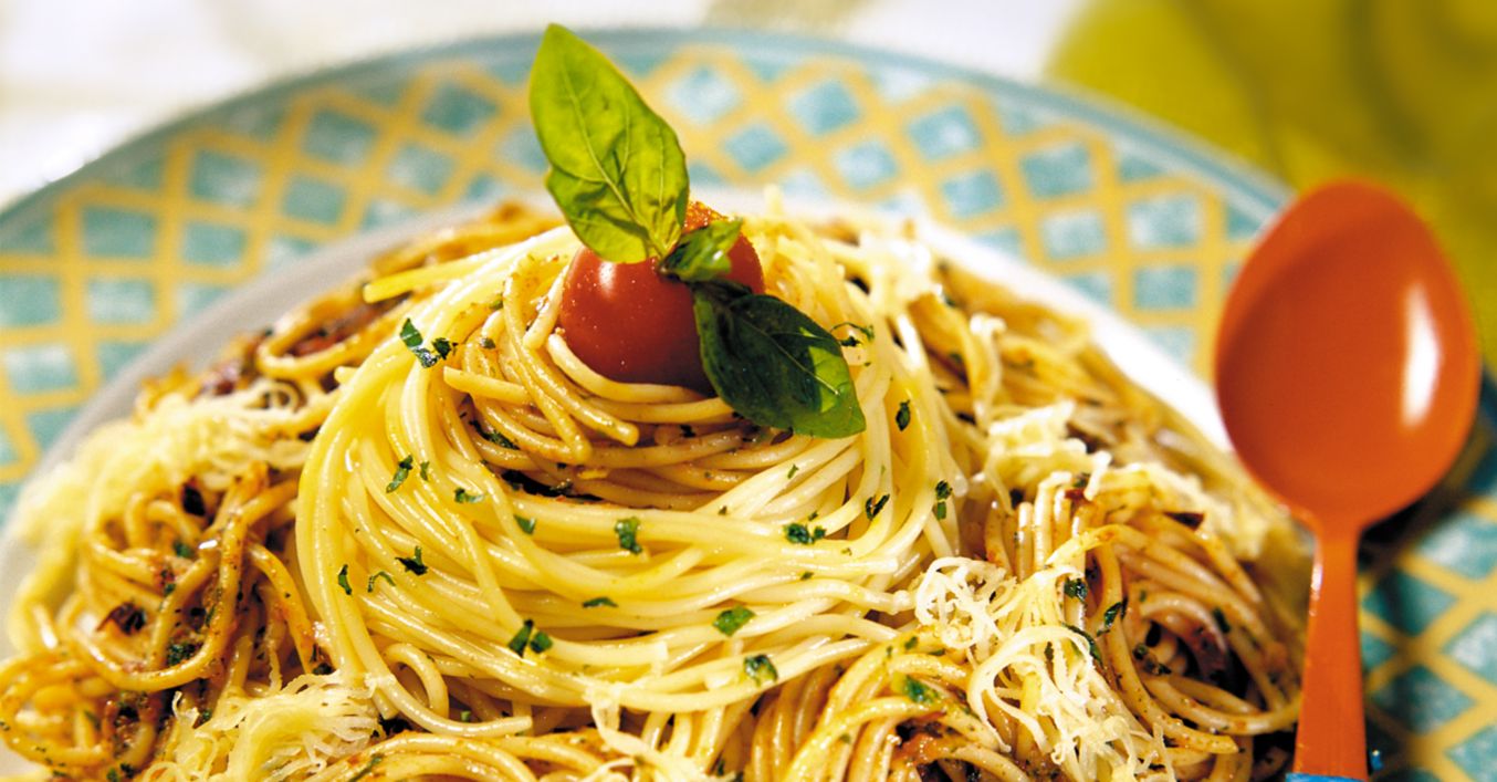 Готовите спагети се разбъркват, поръсват се с настърган кашкавал или сирене „Пармезан“ и се сервират.
