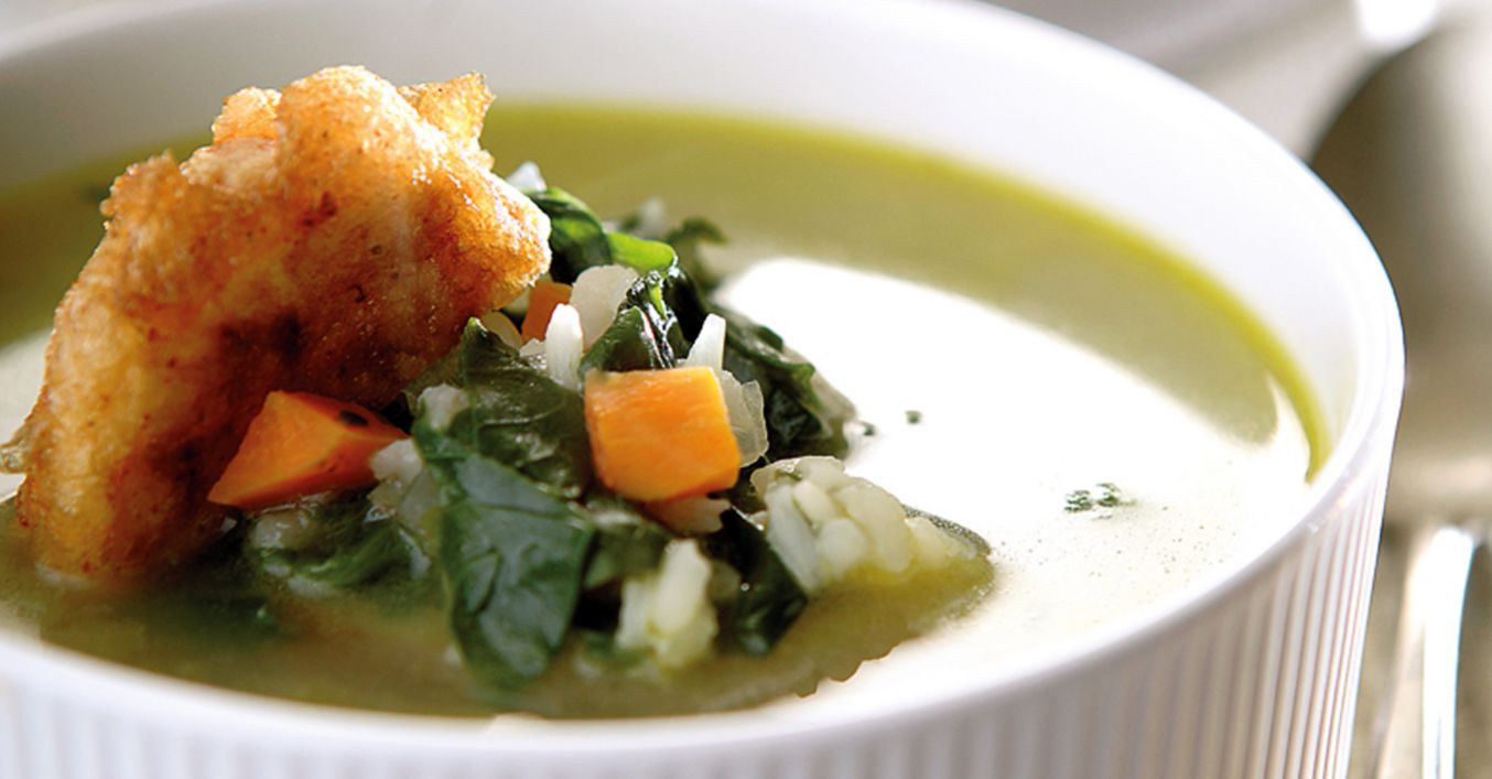 Спаначена супа със сметана и хапки от пушено сирене