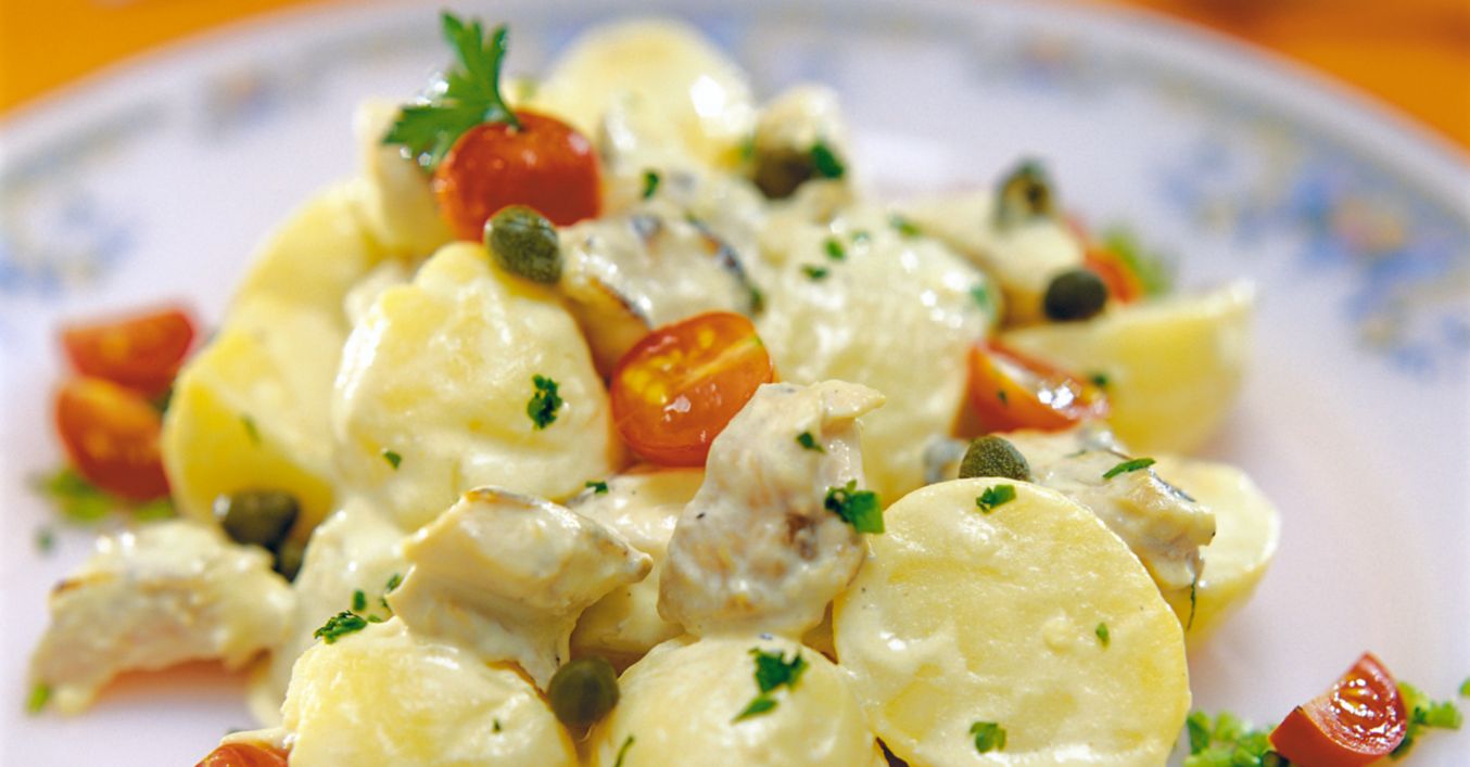 Пилешкото месо се нарязва на кубчета и се маринова с лимоновия сок и солта. Оставя се за 15 минути, запържва се в сгорещения зехтин за около 3-4 минути от всяка страна и се оставя да се охлади. Картофите се нарязват на кубчета.