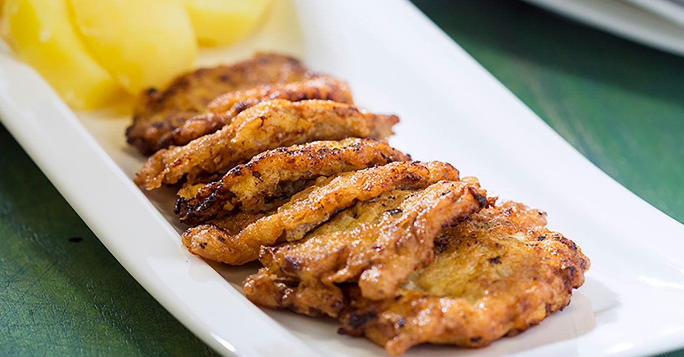 Шницелите се поднасят със сварени картофи, овкусени с маслиново масло и сол.
