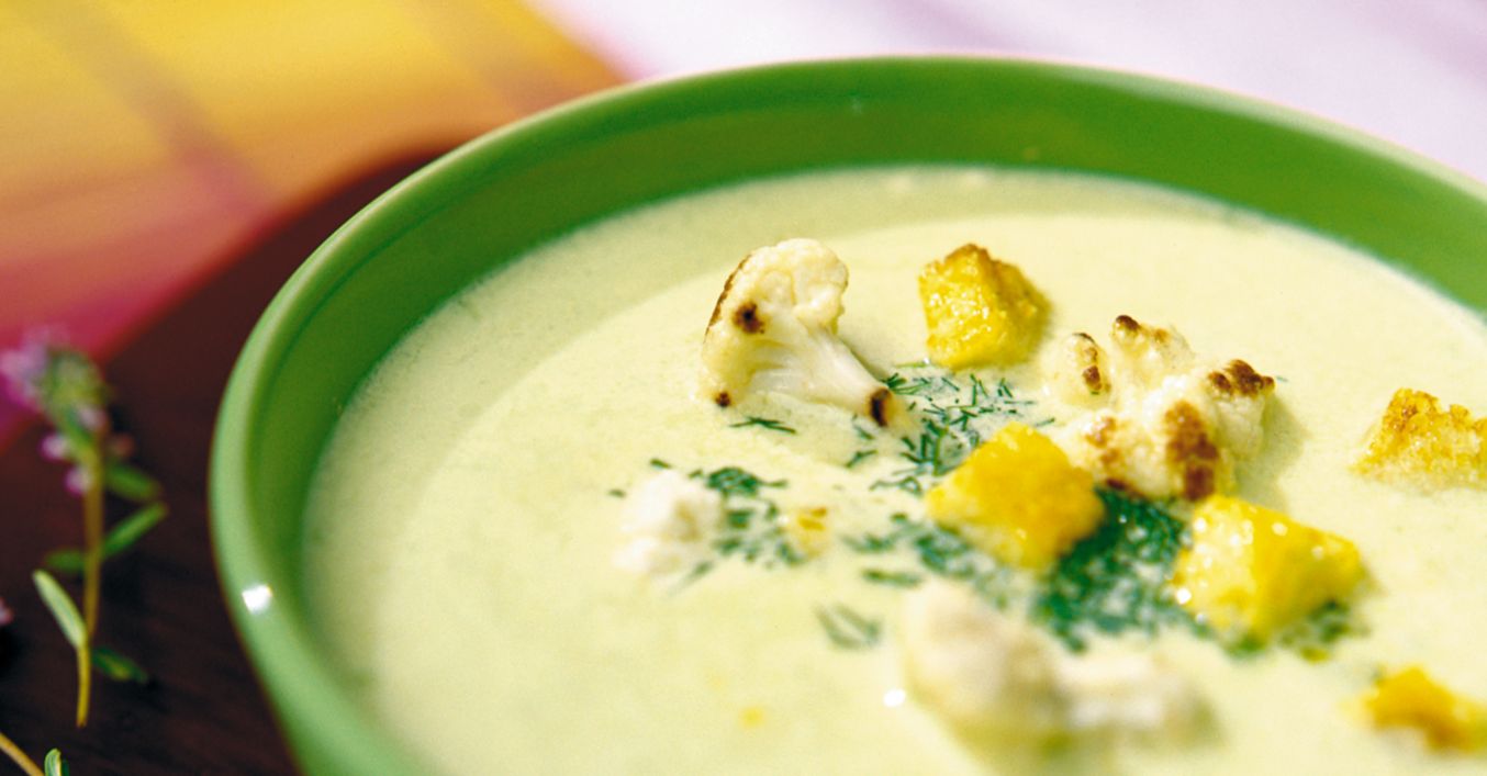 Супата се сервира в купички, декорирана с карфиолени розички, кротони и поръсена със ситно нарязан пресен копър.