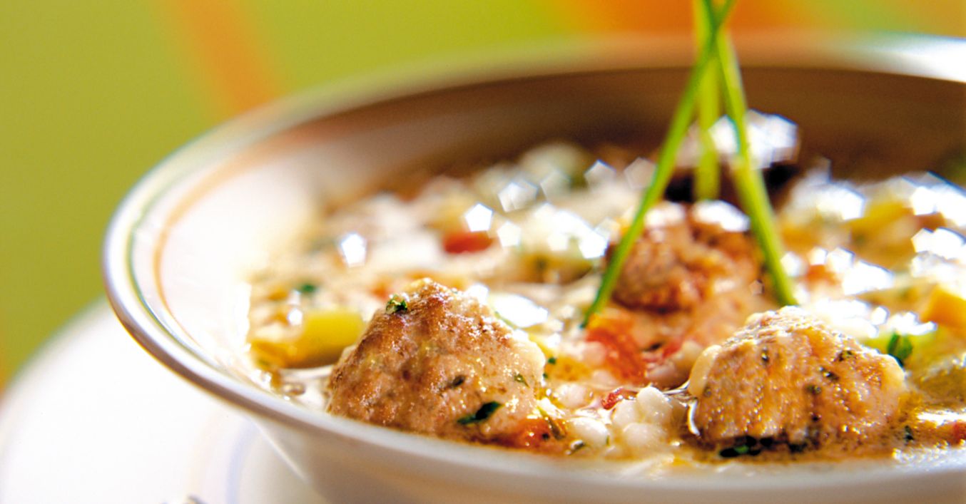 След това се поставят набрашнените топчета и обелените и нарязани на ситно домати и се вари още 15 минути. Прибавя се останалият ориз и 5 минути преди тенджерата да се отстрани, се поръсва с останалата чубрица и наситнените листа целина.