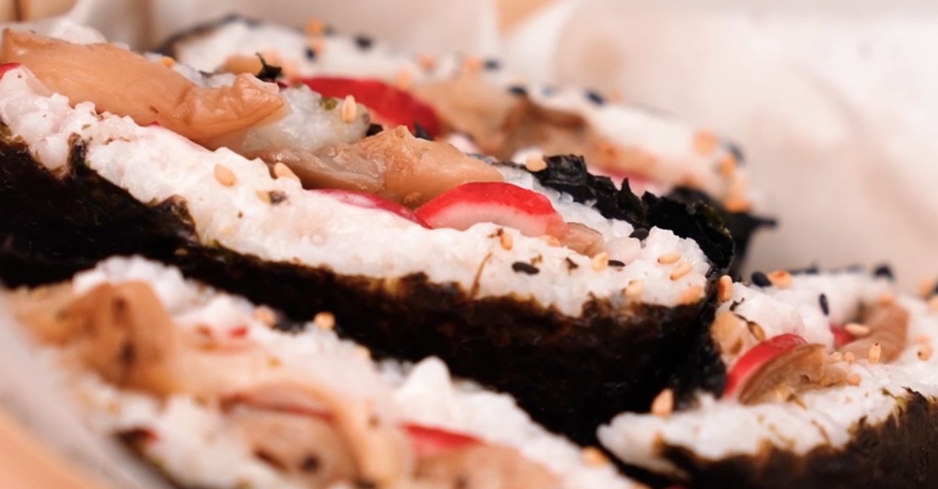 Листата нори се поставя един по един с грапавата страна нагоре върху парче фолио. В средата се слага по малко количество ориз, после от гъбите стриди, резенчета репички и веган майонеза (или друга гарнитура по избор), а отгоре отново се добавя малко ориз. След това ъглите на кората се сгъват с помощта на домакинско фолио.