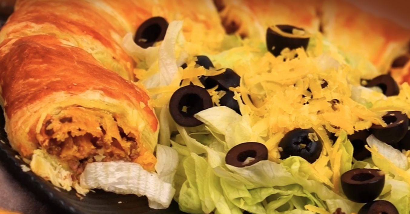 Готовият тако пръстен се пече във фурната за 20-25 минути. Оставя се да се охлади за 5 минути. След това се поставят нарязаната маруля, маслините и малко настърган чедър в средата на ринга. Сервира се горещ със салца.
