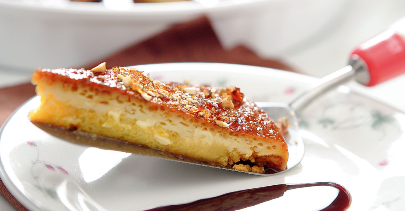 Изстиналият крем карамел се охлажда добре, обръща се върху плоска подложна чиния и се нарязва. Сервира се с крокан от тиквено семе.