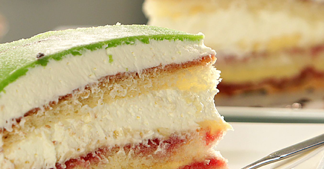 Първият блат се поставя във форма, за да е по-лесно оформянето. Намазва се с част от малиновата смес, а после с 1/2 от ваниловия крем