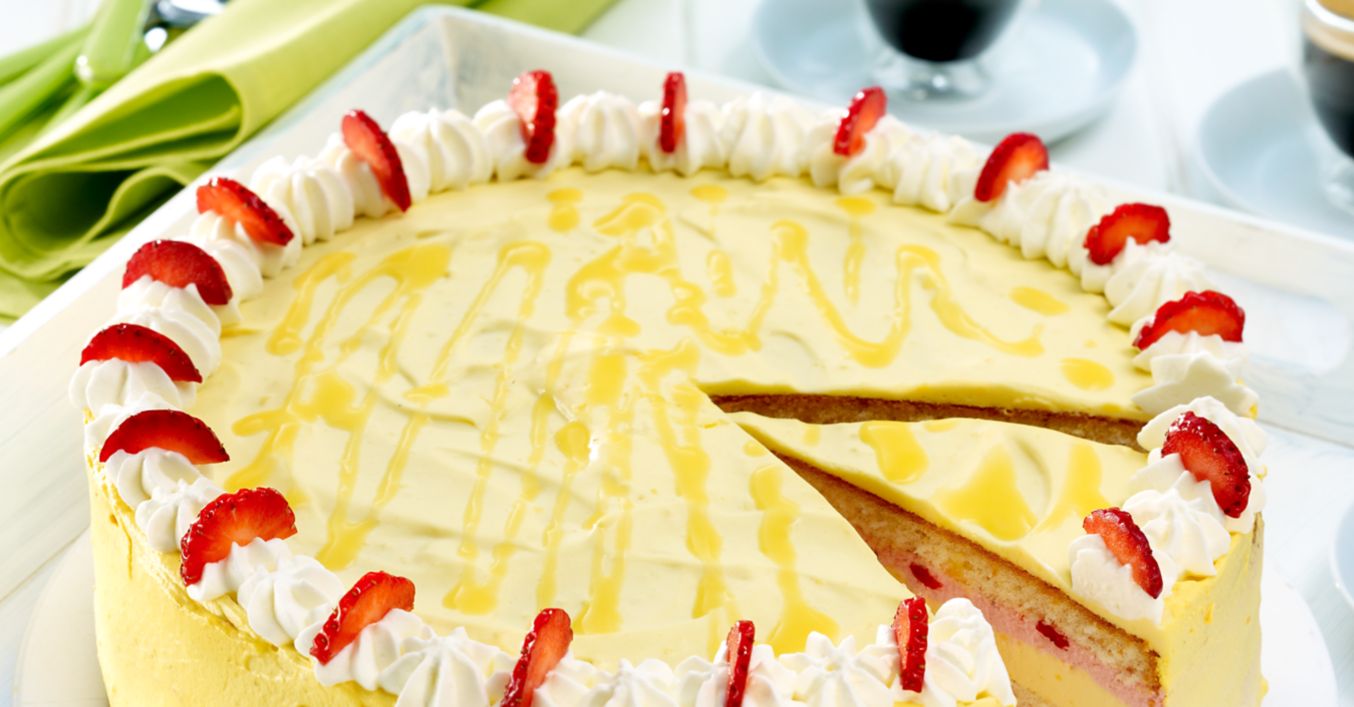 Желатинът се накисва. Половината количество ягоди се нарязва на парченца, а останалите ягоди се пюрират. Готовият блат се нарязва на тънки блатове. Изварата се разбива със захарта и получената смес се разделя на два части. В едната смес се добавят пюрираните ягоди, a в останалата се добавя 100 мл яйчен ликьор. Желатинът се разтваря в купата с нарязаните ягоди и ягодовия крем, останалата половина се добавя към яйчения крем и се оставят в хладилник, докато кремът се желира. 700 милилитра сметана се разбива и половината се добавя към кремовете.