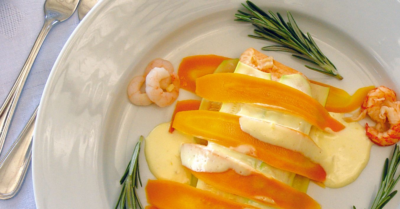 Върху скарата на уреда се подреждат останалата част от морковите и тиквичките и върху тях се слага рибата. Завършва се с няколко лентички от тиквичка и морков. Скарата се поставя в съда и се похлупва. Вари се около 15–20 минути.