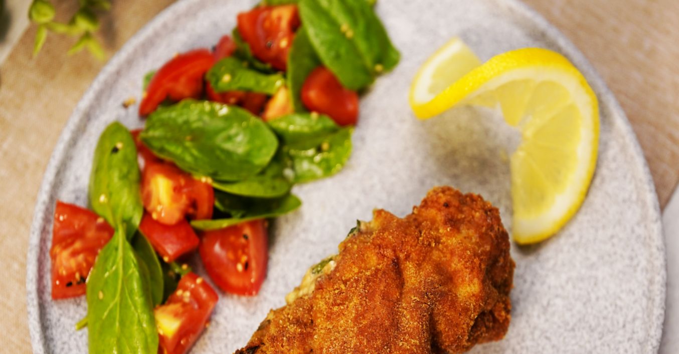 Парчето свински врат се разрязва хоризонтално в средата, като не се отрязва до край (идеята е да се получи нещо като джоб). Напълва се със спаначената смес. Овалва се в брашното, разбитите яйца, галетата, отново в разбитите яйца и още веднъж в галетата.