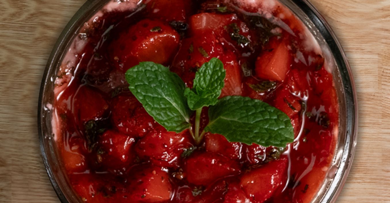 Почистените ягоди се режат на малки кубчета. Към тях се добавя ситно нарязаната мента и се поръсват с пудра захар. В метална купа на водна баня ягодите се пошират за 3-4 минути, а след това се покриват със стреч фолио и се оставят настрани, за да се запарят и изстинат.