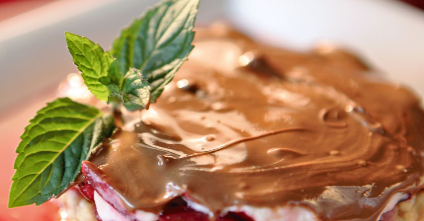 Бисквитената смес се разпределя в метални пръстени, които се пълнят до 1/3. Притиска се добре и се покрива със сместа от сметана и череши. Пръстенът се отстранява, десертите се поливат с разтопения шоколад и се декорират с листа мента.