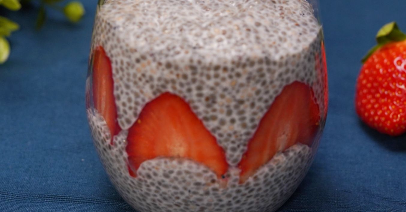 След час чиата би трябвало да се е желирала и да има консистенция на пудинг. В чаша за сервиране се сипва половината от пудинга. След това се слага ред ягоди, нарязани на половинки.