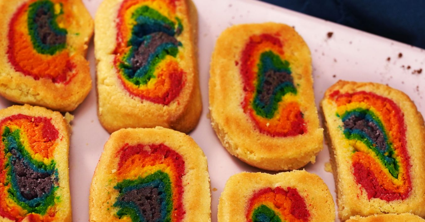 Лилавото тесто се оформя с ръце на дълга и тясна ивица. След това с помощта на точилка се разточва на малко по-широка и по-тънка от лилавото тесто ивица синьо тесто. Същото се повтаря със зеленото, жълтото, оранжевото и червеното тесто, като червената ивица трябва да е най-широка. Лилавата ивица се увива в синята, след което в зелената, жълтата, оранжевата и накрая в червената. Оставя се в хладилник за 30 минути.