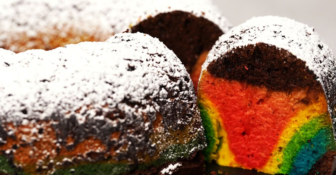 В предварително набрашнена форма за кекс се сипва първо половината от какаовата смес. След това една по една се добавят червената, жълтата, зелената и синята смес. Накрая се завършва с останалата какаова смес.