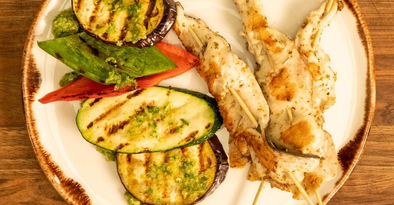 Шишчета от пъстърва с гриловани зеленчуци
