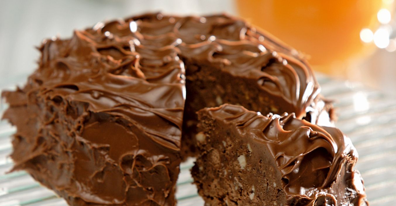 Сместа се оформя като торта в кръгла чиния, намазва се обилно с течния шоколад и се оставя да престои около 2 часа в хладилник.
