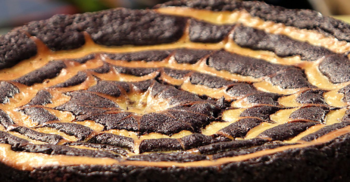 Върху какаовата смес с поша се оформят четири кръга и с клечка за зъби се рисува паяжина. Десертът се пече в загрята на 180° C фурна с вентилатор за 40 минути.