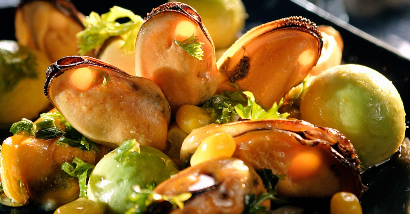 Мидите се поставят в купа. Добавят се нарязаните наситно чушка, чесън и лук.