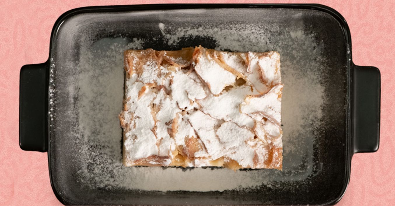 Сервира се с лека поръска от пудра захар върху парчето.