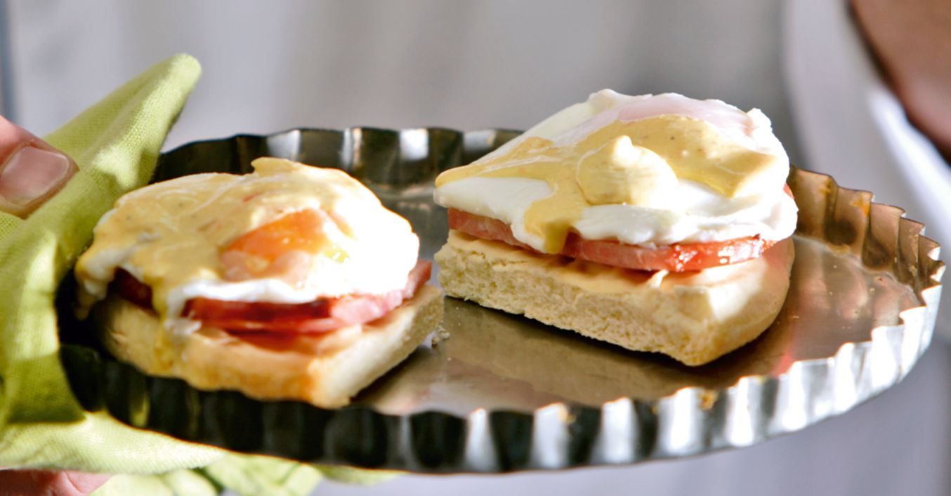 В чинията за поднасяне се поставят 2 препечени половинки питки, върху всяка се слага по една леко препечена филийка бекон, а върху всяко парче бекон – по едно забулено яйце.