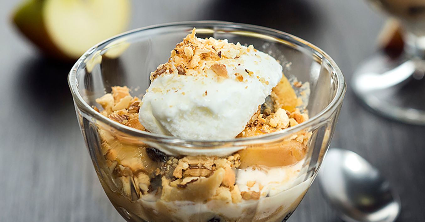 Ябълките се сервират върху сладолед, поръсени с ореховата смес.